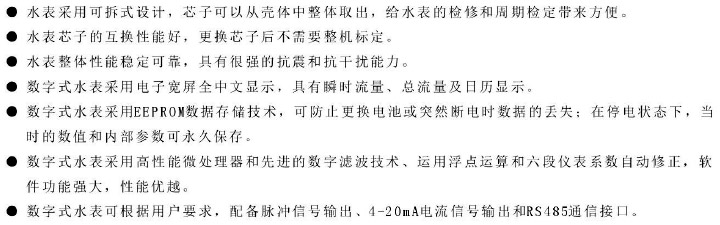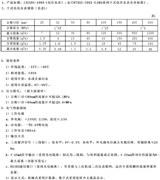 我公司生產的LXRG系列干式高壓水表是一種速度式的機電一體化流量測量儀表。該系列儀表在設計、改進過程中,著重考慮到油田等場所的用表環(huán)境和管理方面的實際情況,并吸取同類產品的優(yōu)點,具有計量準確度高、測量范圍寬、結構簡單、壓力損失小、安裝維修方便等優(yōu)點,廣泛適用于石油、化工的高低壓注水和污水處理計量與控制。